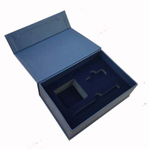 Caja de regalo de embalaje con cierre magnético de cartón rígido de cuero azul oscuro con logotipo grabado dorado personalizado con inserto de espuma EVA